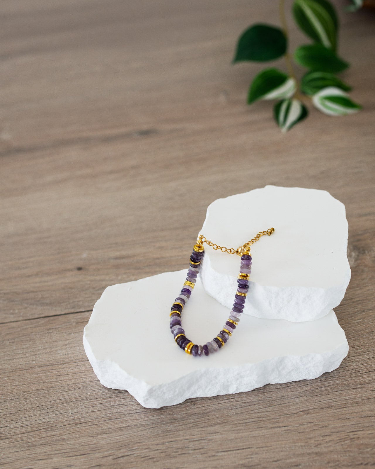 Le bracelet Alma doré en Améthyste apaise les pensées et invite à la clarté intérieure. Sa pierre violette, symbole de sagesse, se marie à la délicatesse du doré pour créer un bijou à la fois spirituel et élégant.