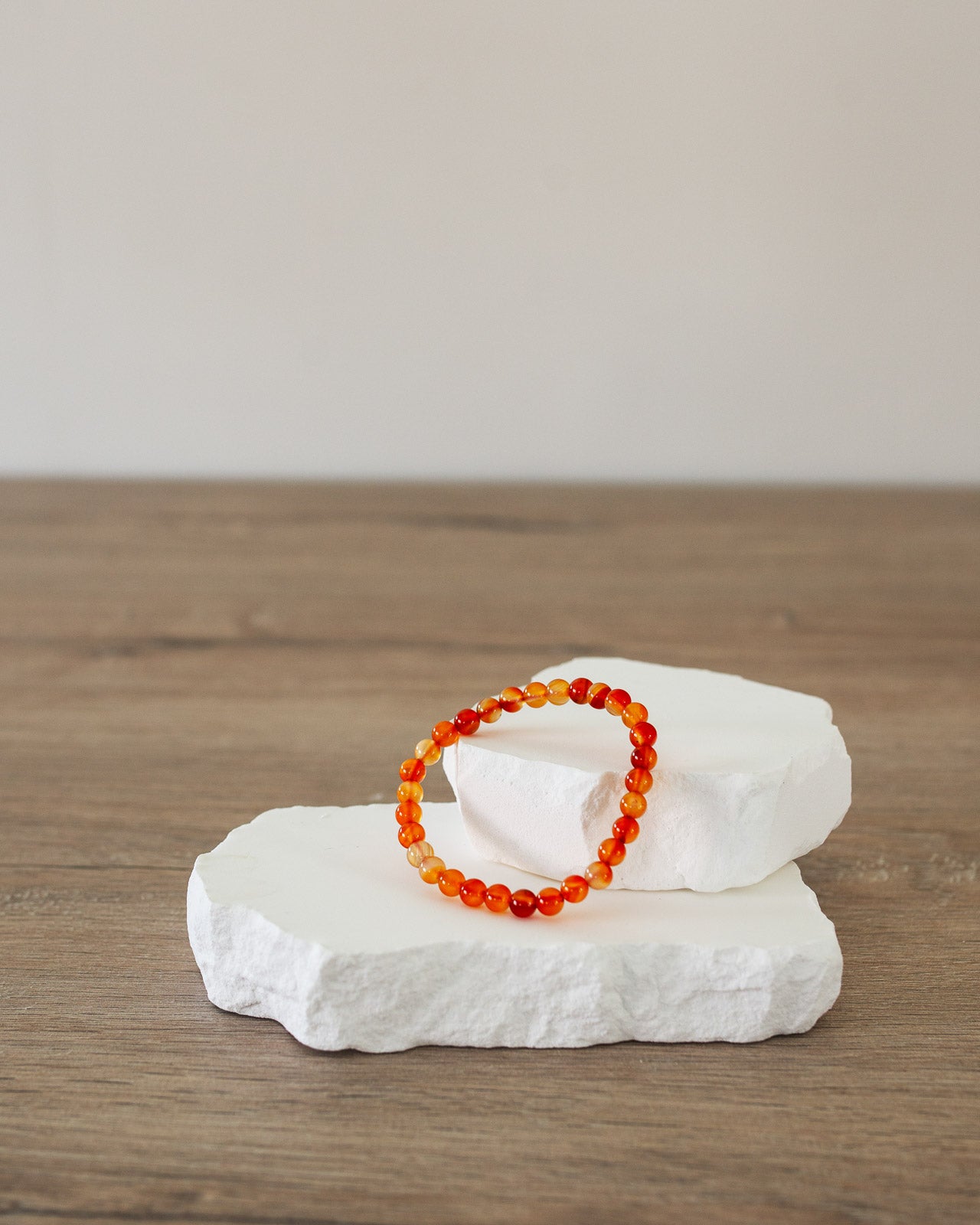 Le bracelet en perles de Cornaline insuffle force et vitalité. Sa teinte orangée éveille la joie, le mouvement et la confiance en soi.