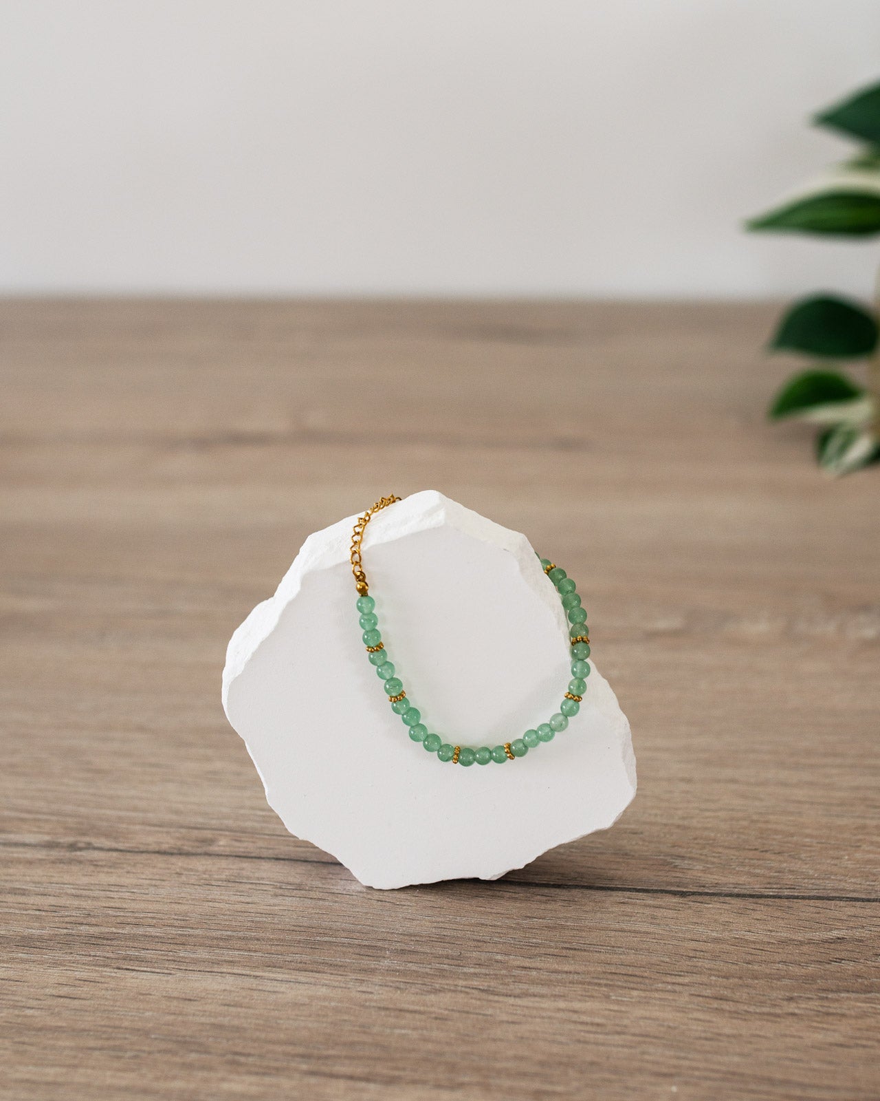Le bracelet Pure doré en Aventurine Verte attire l’énergie positive et stimule la créativité. Ses nuances vertes apportent fraîcheur et élégance à votre poignet, tout en favorisant équilibre et sérénité.