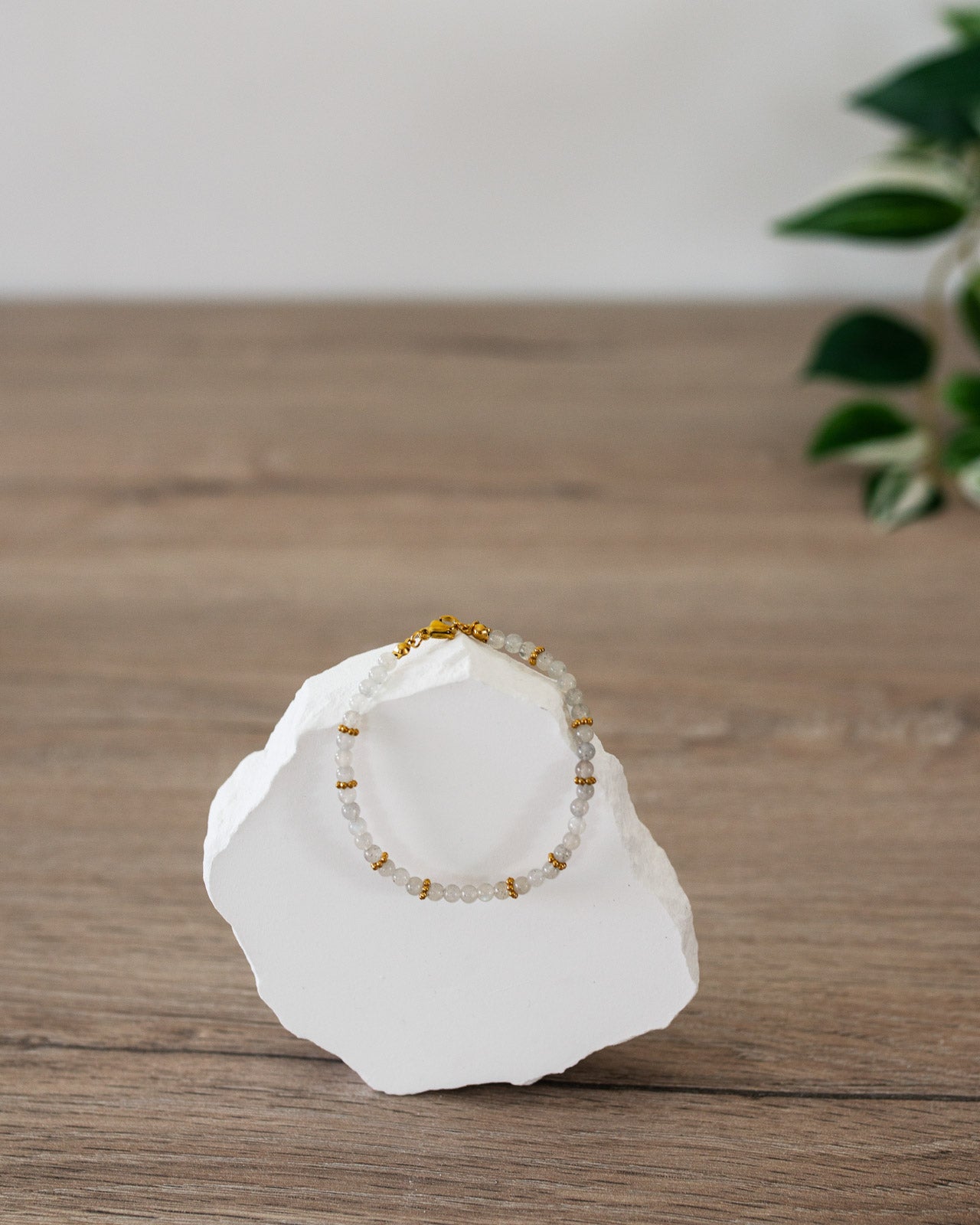 Le bracelet Pure doré en Labradorite attire les énergies positives et stimule l’intuition. Ses reflets irisés apportent mystère et élégance à chaque mouvement.