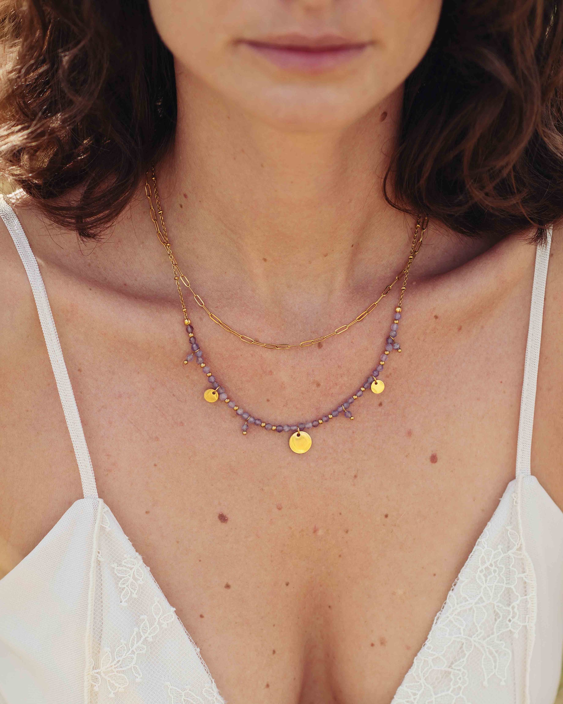 Le collier Solaris doré en Améthyste associe une fine chaîne ras du cou à une seconde, plus longue, ornée d’une pierre d’Améthyste. Ce bijou double symbolise l’équilibre entre terre et esprit, apportant paix intérieure et raffinement.