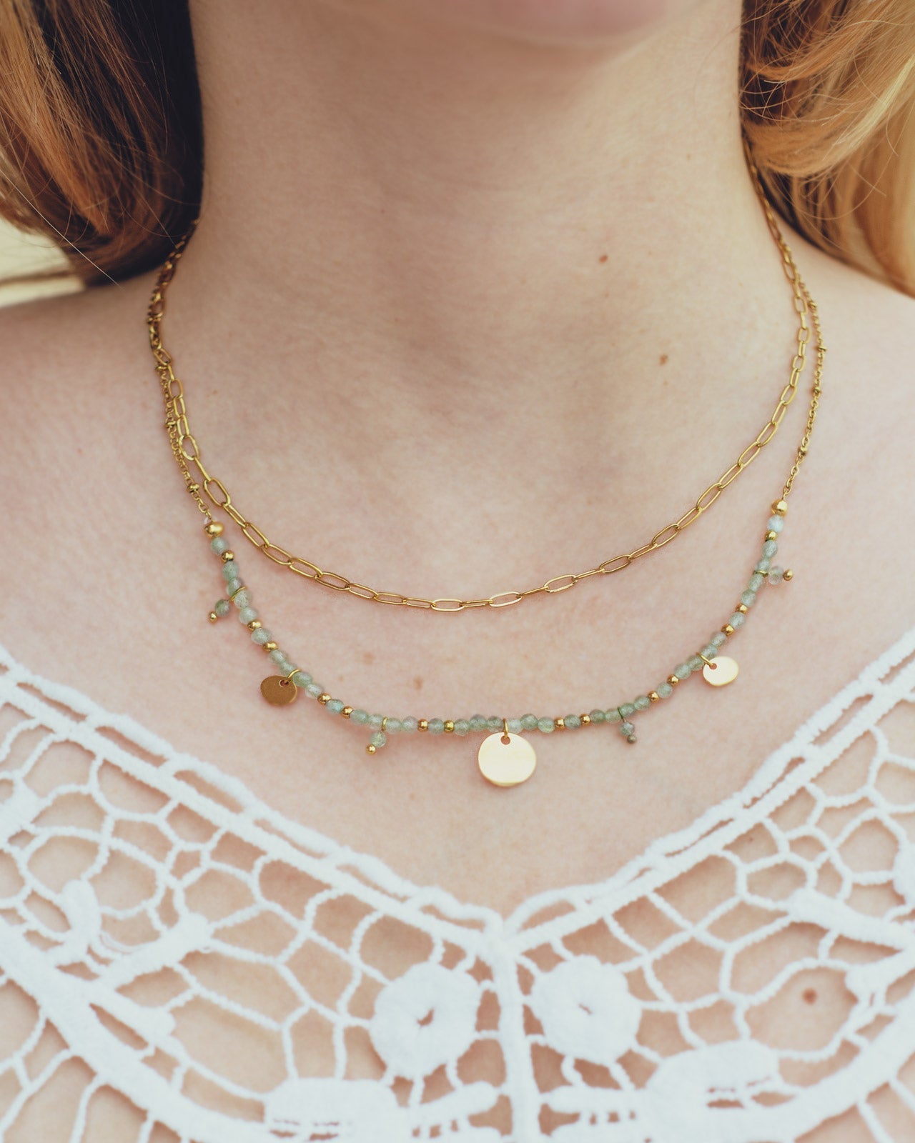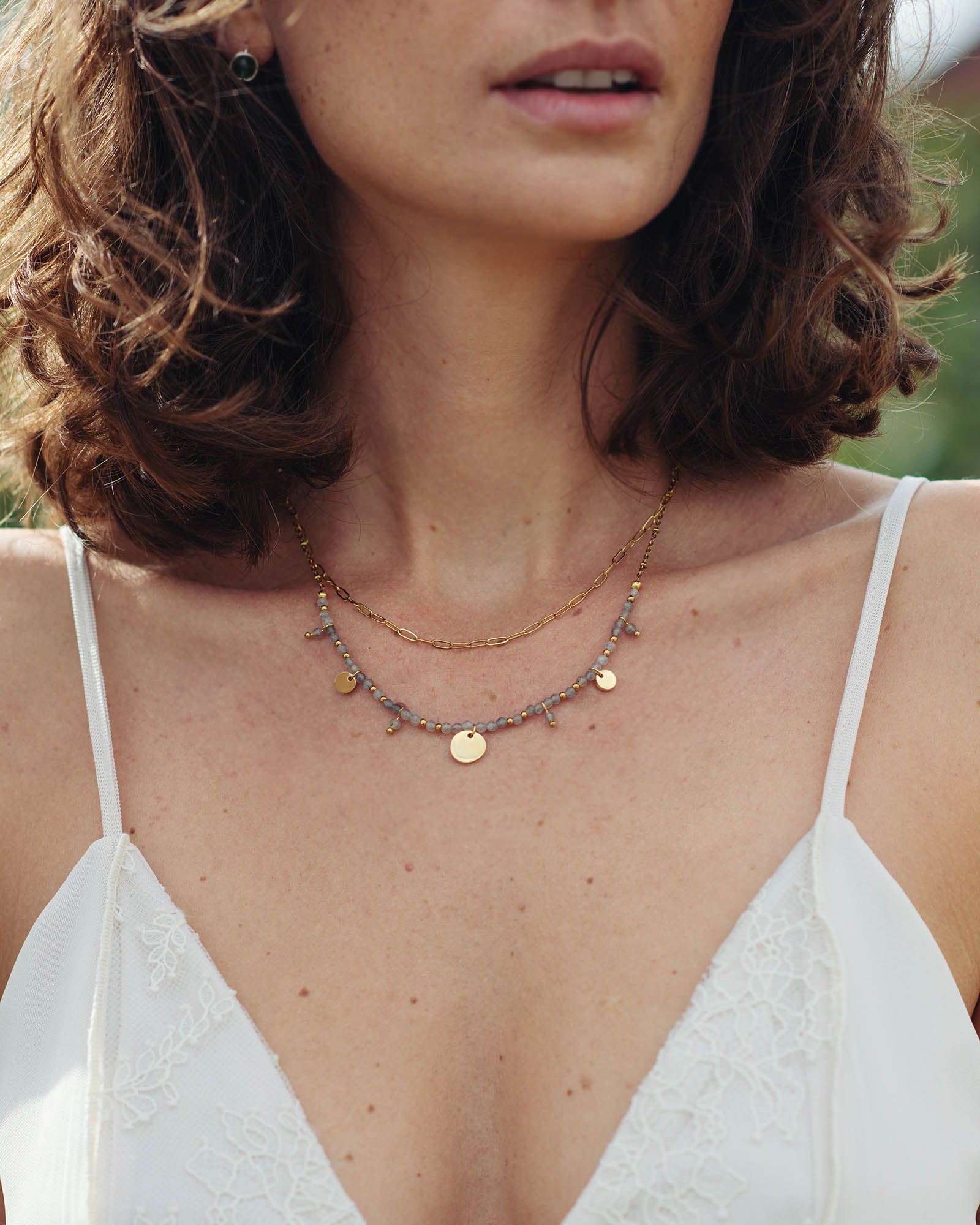 Le collier Solaris doré en Labradorite séduit par ses reflets changeants et mystérieux. Sa double chaîne dorée sublime cette pierre de protection, qui accompagne les transitions et renforce la confiance en soi.
