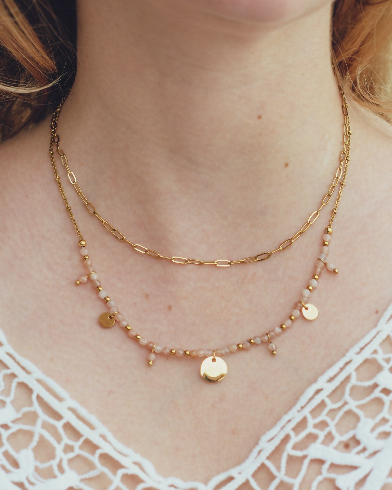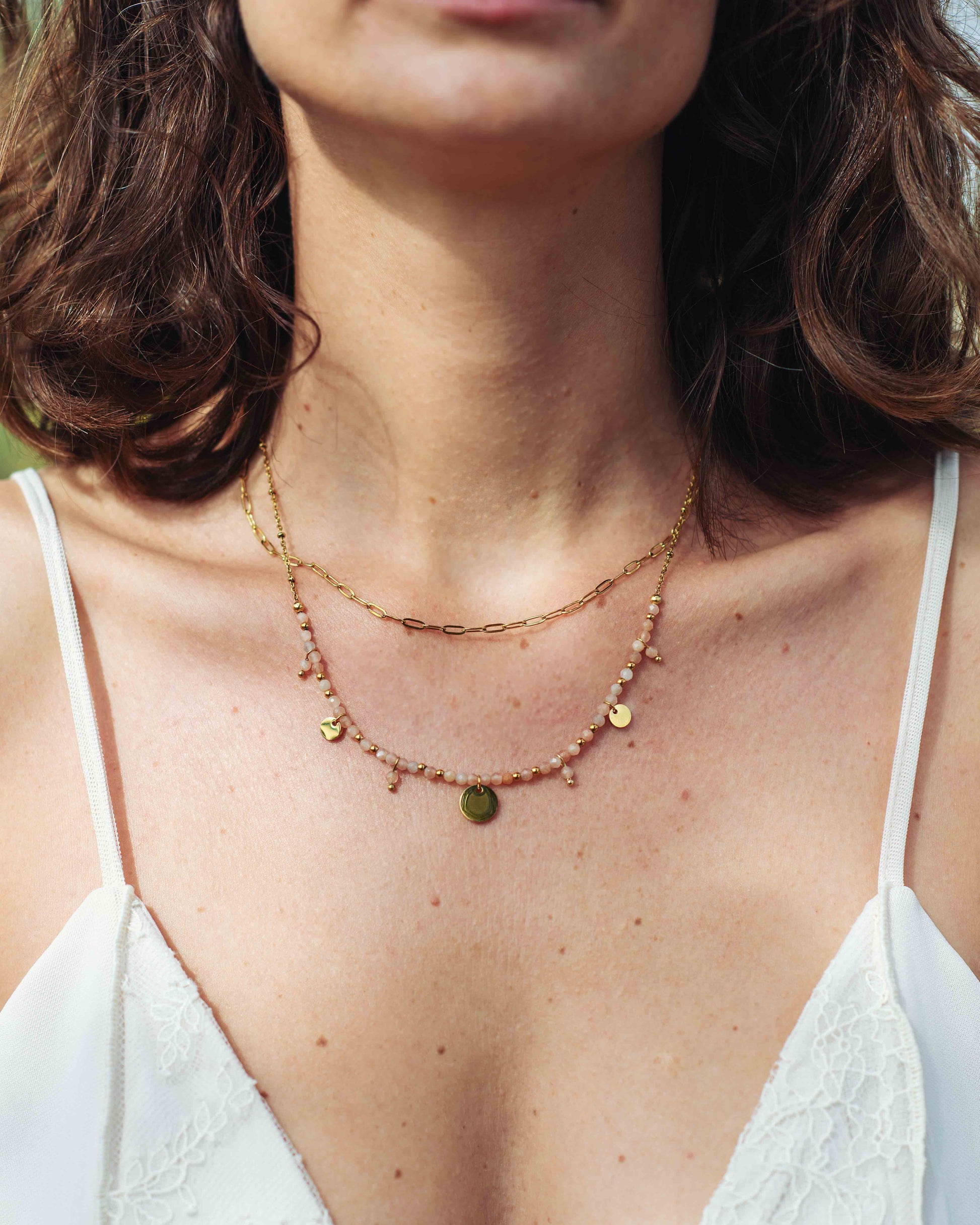Le collier Solaris doré en Pierre de Lune reflète douceur et mystère. Sa double chaîne dorée capte la lumière et met en valeur cette pierre féminine, symbole d’équilibre et de réceptivité.